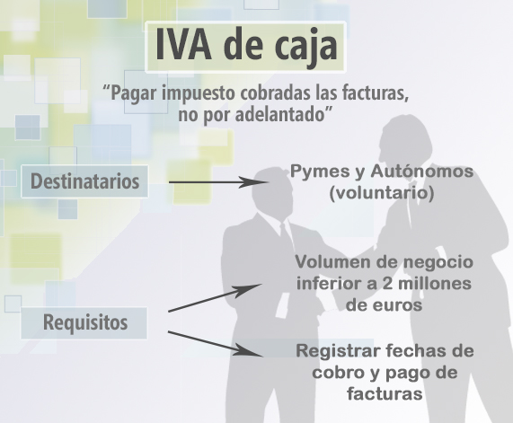 El nuevo régimen de IVA de caja se ha aprobado por la ley de Emprendedores, mediante la cual las pymes y autónomos deberán pagar el IVA de sus facturas pendientes en el momento de cobrarlas y no en el momento de emitirlas. Esta ley, que entró en vigor el día 1 de enero del 2014 es de caracter voluntario y todos aquellos que lo deseen pueden acogerse a ella, aplicándose en los sucesivos años. Así mismo, existe la posibilidad de renunciar o ser excluido por no cumplir los requisitos.